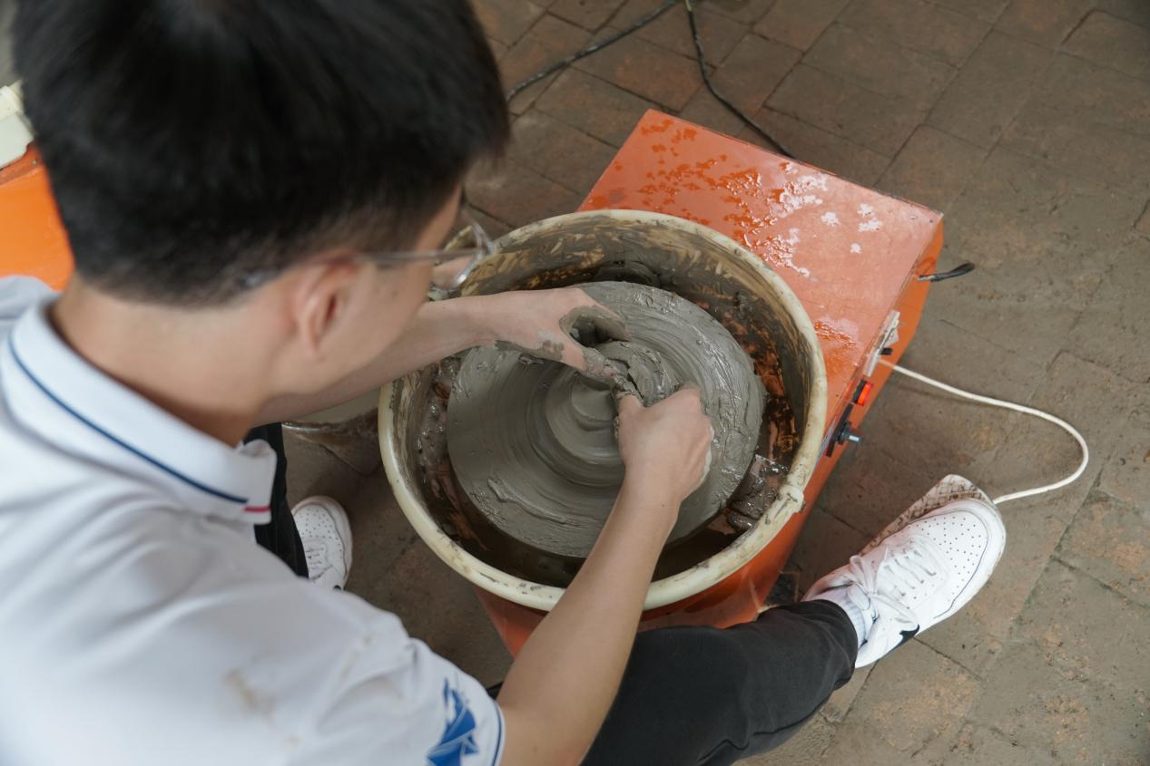 在拜访了刘师傅之后,实践队员一行人前往当地民窑实地观察了瓷器形成的产地。如果没有相关人员的介绍,实在让人很难相信地上水泥一般的材料便是制作陶瓷的主体材料,陶缸中方式的细腻的“流沙”竟然会在日后被技艺者制作成厚重精美的瓷器。实践队员也在陶瓷学徒的帮助下亲手尝试了制作黑瓷的过程,用脚小心控制着转盘的转速,双手细致地将一团土胚捏成自己想要的形状,这么一个创作的过程,让所有队员都惊呼奇妙。