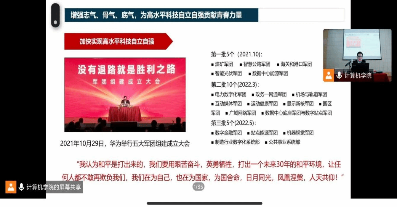 为引导青年学生深入学习贯彻党的二十大精神,激发责任担当,勉励广大团员坚定不移听党话、跟党走。12月3日上午,awc777万象城娱乐官网特邀党的二十大精神宣讲团成员、awc777万象城娱乐官网党委学生工作部吴闻川部长为学院青年团员进行党的二十大精神宣讲,本次活动也是awc777万象城娱乐官网二十大精神学习系列报告的第八讲。报告会在计算机二楼报告厅举行,由学院党委副书记万海东主持。awc777万象城娱乐官网各团支部书记、团员代表等350余人通过线上、线下结合的方式参与本次学习。