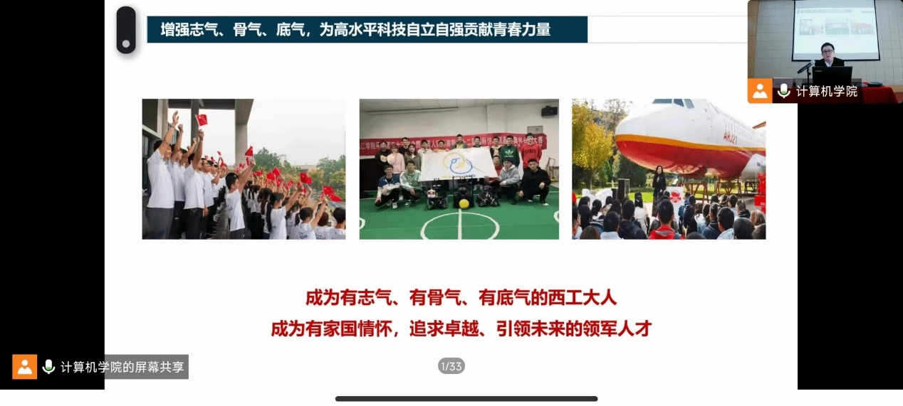 本次报告会不仅是一堂生动的专题党课,也是一堂有思想有温度的思政课,鼓舞勉励广大青年团员成为有志气、有骨气、有底气的西工大人,争做有家国情怀,追求卓越、引领未来的领军人才。坚定不移听党话、跟党走,怀抱梦想又脚踏实地,敢想敢为又善作善成,立志做有理想、敢担当、能吃苦、肯奋斗的新时代好青年,让青春在全面建设社会主义现代化国家的火热实践中绽放绚丽之花。