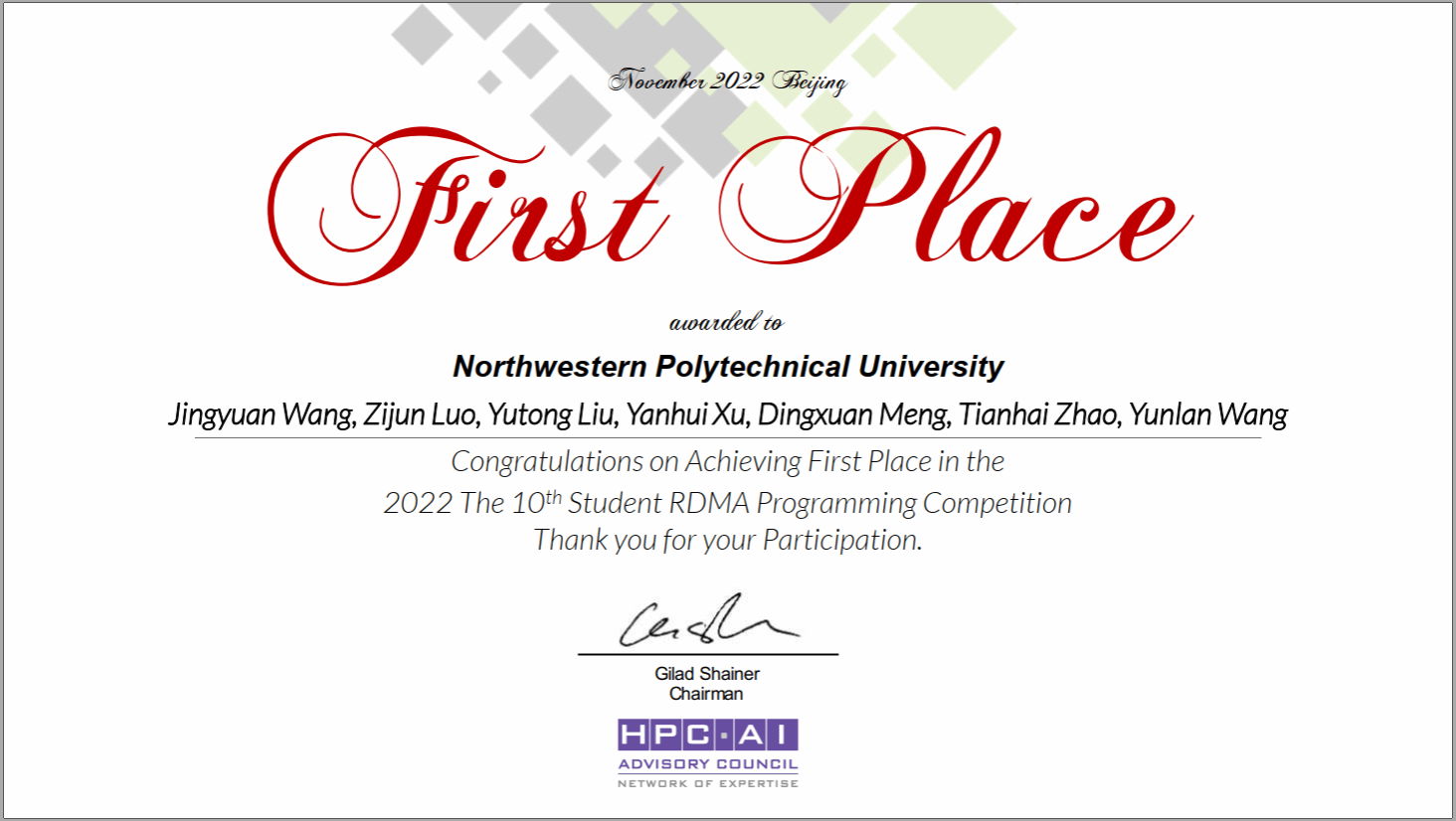 第十届亚太区RDMA编程竞赛由国际高性能计算和人工智能咨询委员会(HPC-AI Advisory Council)举办,得到了中国中科院计算所、清华大学和美国俄亥俄州立大学的大力支持。依托万象城超级计算机系统创新实践基地,在awc777万象城娱乐官网高性能计算中心教师赵天海、王云岚、谷建华、侯正雄指导下,经过培训和筛选,由awc777万象城娱乐官网学生王靖元、罗梓峻、刘雨桐、徐研辉、孟鼎轩组成了awc777万象城娱乐官网代表队。