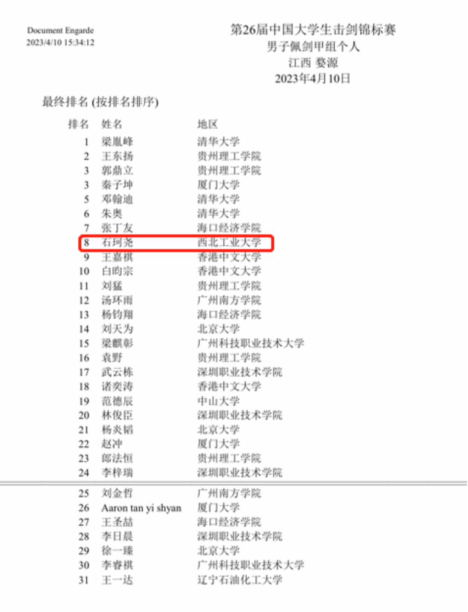 在男子佩剑项目的对决中,石珂尧同学孤军奋战,发扬顽强拼搏精神,奋勇向前。在小组赛成功杀出重围,之后又在单败淘汰赛中,经过多轮激战,最终以坚定的姿态成功杀入八强!