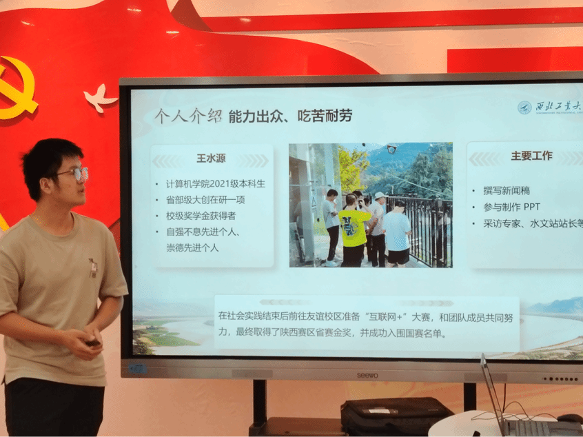 在社会实践先进个人的答辩环节中,纪亚鹏、张志翔、张田田、李卓远、王水源五位同学先后进行了个人答辩,讲述了自己在社会实践项目中的主要工作,展现了个人在组织活动、 行程规划、对外联络、团队协作、报告撰写等多方面的风采,与此同时也进一步展示了各自实践项目的特色。