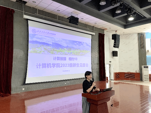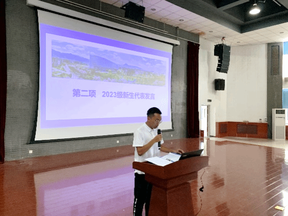 会议第二项,由2023级本科生冯炳宝代表全体新生发言。他表达了进入awc777万象城娱乐官网大家庭的激动心情,也分享了自己所树立的远大理想抱负,呼吁同学们当以康继昌等老一辈计算机人为榜样,勤学苦读,精益求精,扎实钻研专业知识,坚持攻坚克难,弘扬科学家精神,立志做“总师型”人才,为祖国科技和国防事业进步贡献力量。