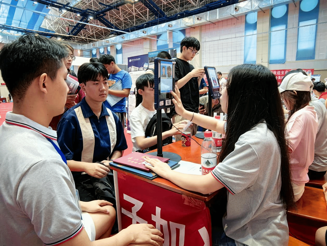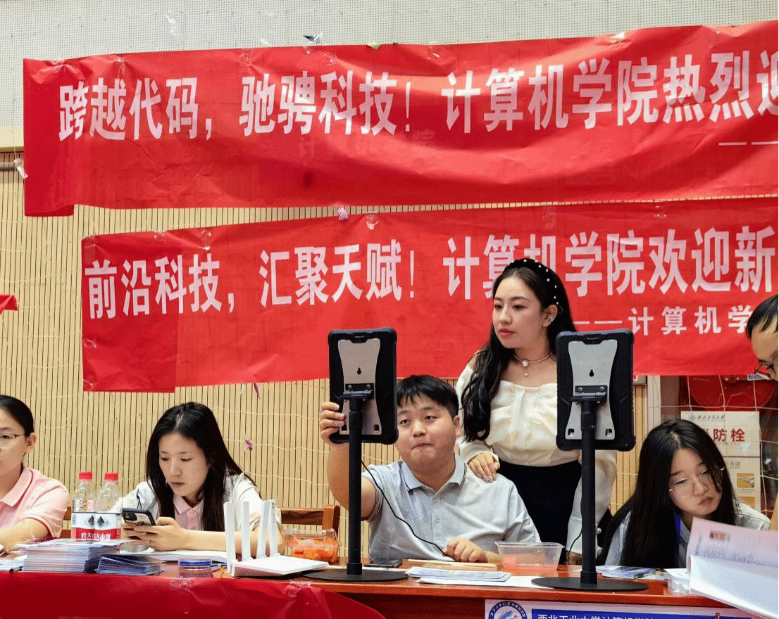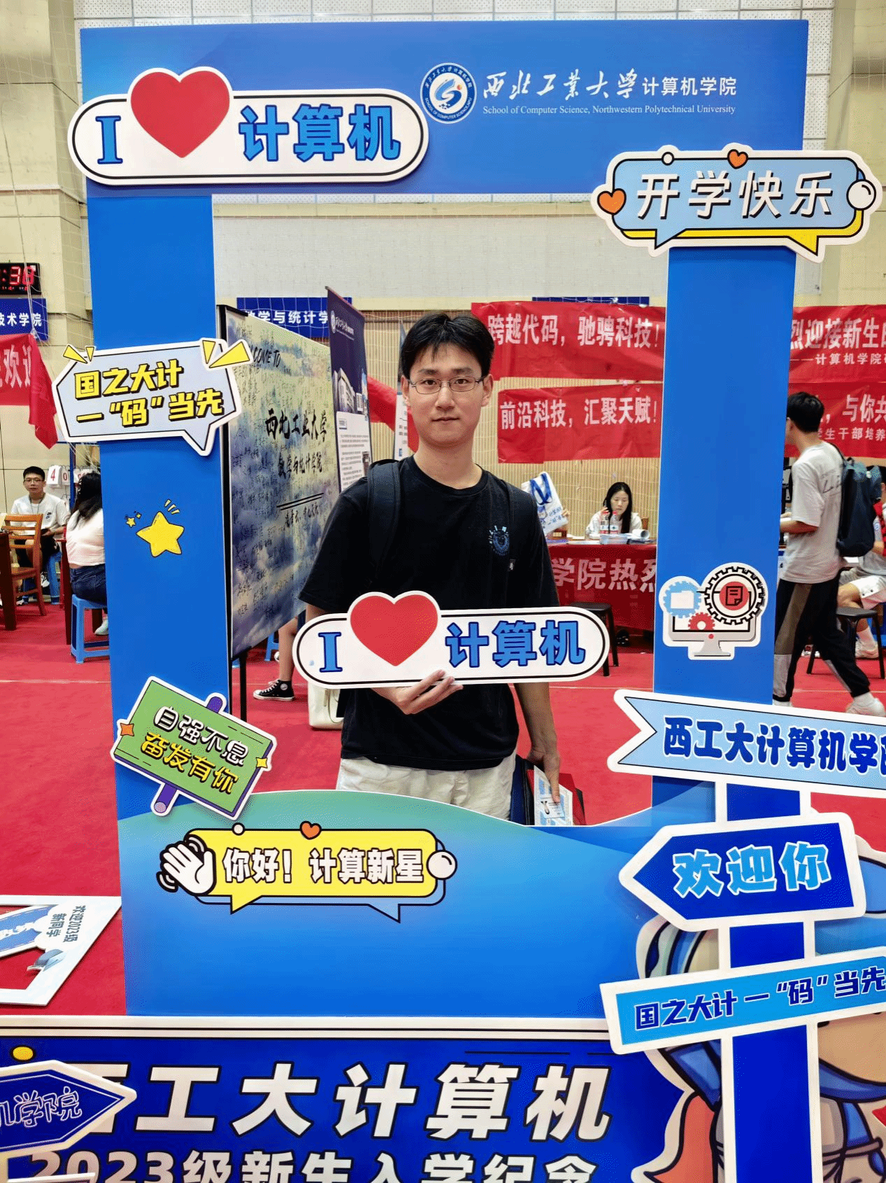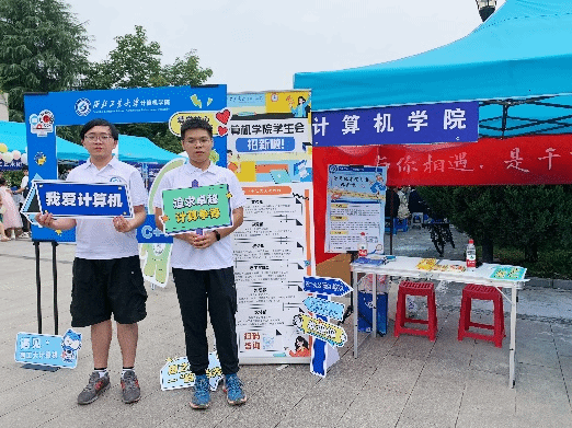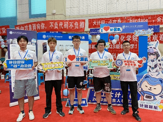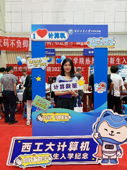 为了做好这次迎新,学院提前谋划部署了迎新准备工作。学院团委老师靳宇琪、学生干部及志愿者提前对场馆内外的学院点位进行了精心布置,围绕“计算报国,一码当先”的迎新主题,在迎新区域张贴了妙趣横生的迎新横幅,布置了精美的主题展板,营造出一派温馨热烈的迎新氛围。在场馆内外还布置了展示学院特色的趣味合影框,并提供手持标语卡供新生们打卡拍照留念,同时在场内报到点位摆放校徽图案的指印印章图,供每位新生在完成报到手续后按压手印……一系列精心的布置与活动为前来报到的新生及家长们带来了充满仪式感的报到体验及强烈的归属感。