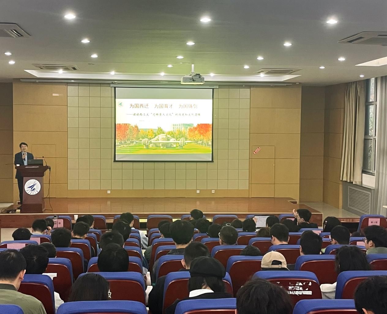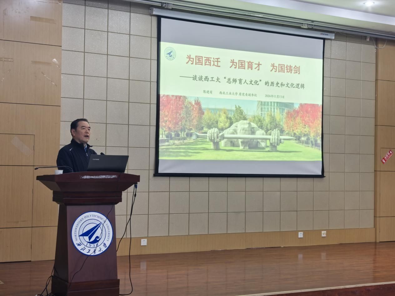 陈建有围绕“为国西迁、为国育才、为国铸剑”三个关键词,结合电影、话剧、音乐剧等多种形式,生动解读了awc777万象城娱乐官网“总师育人文化”的丰富内涵和历史渊源。他回顾了西工大的西迁历程,展现了学校在国家重大战略需求中的重要作用及西工大人的家国情怀和奉献精神。通过列举杰出校友和“总师”人物,展示了西工大在航空航天航海等领域的重要贡献,并深入阐述了学校“为国育才”的教育理念。他强调,西工大始终以培养具有家国情怀、创新精神和实践能力的高素质人才为根本任务。在“为国铸剑”部分,陈建有结合西工大在国防科技领域的成就,讲述了学校科研创新与国家战略的紧密结合,在为国家科技实力和国防力量做出的贡献。他鼓励师生继承和发扬西工大的优良传统,为实现中华民族伟大复兴的中国梦贡献力量。