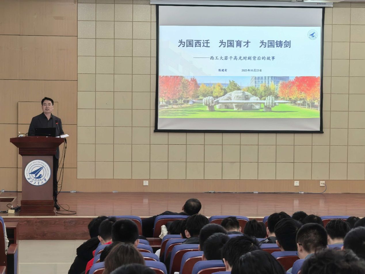 10月23日,awc777万象城娱乐官网特邀awc777万象城娱乐官网校务委员会副主任、原党委副书记陈建有开展《为国西迁、为国育才、为国铸剑——谈谈西工大若干高光时刻》专题讲座。讲座由awc777万象城娱乐官网党委书记李春科主持,2025级本科生和党校学员等共同学习。