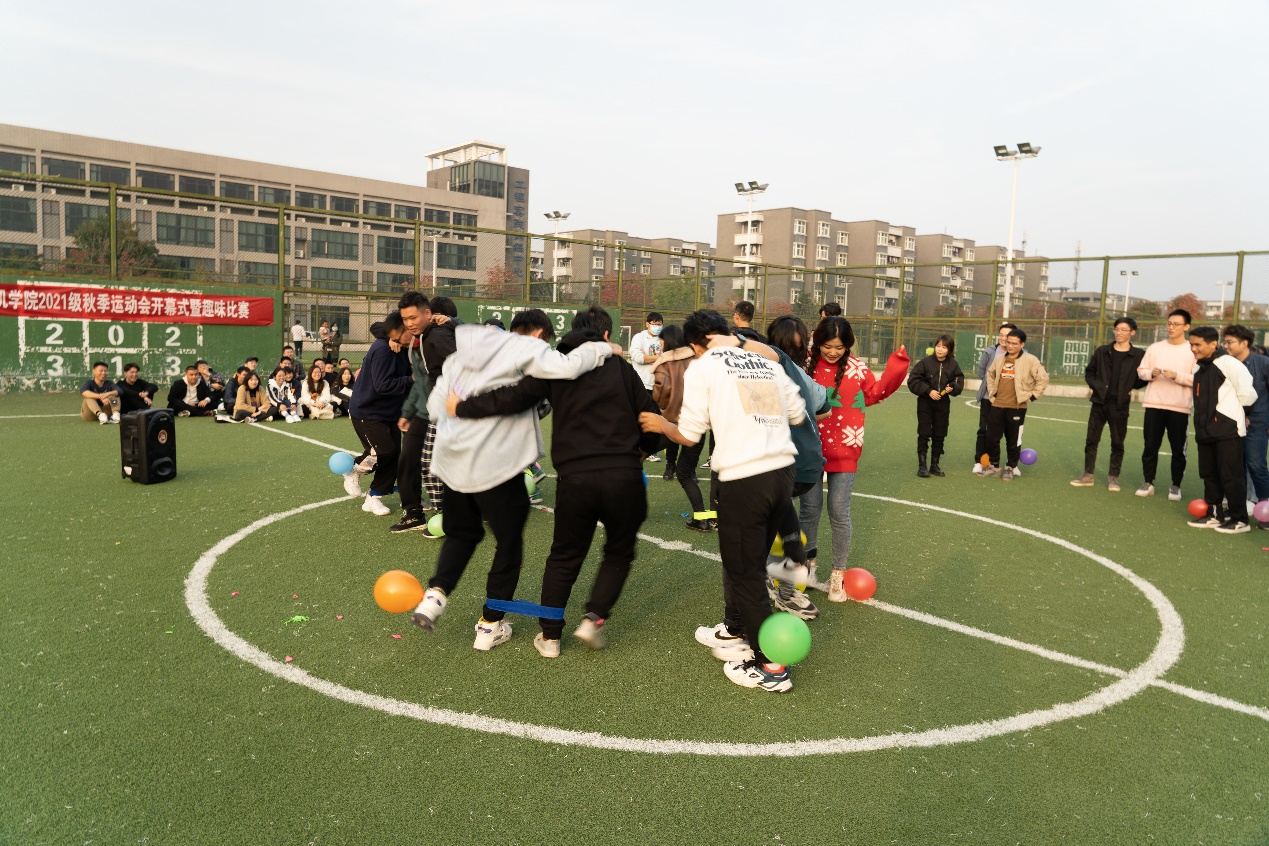 快乐“彩”球比赛中,每队两个气球以及绳子,采取两人三足的绑法,并将气球绑在两边的脚上,在规定区域内,听到主持人发出哨音后,开始用脚踩破他队的气球,若两个气球均被踩破即淘汰,直到游戏时间结束。考验着队友的协作与对手的对抗能力,在比赛过程中当对手摔倒时,同学们也会友好地拉起摔倒的对手,拉近了同学们之间的距离。
