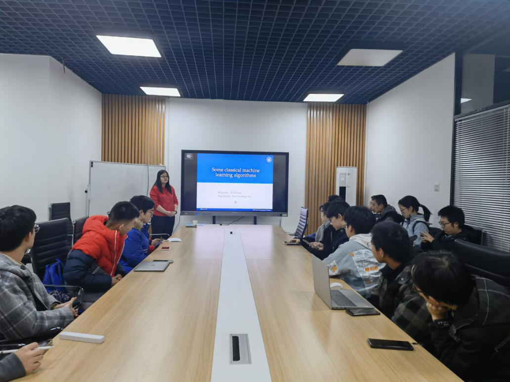 董侠为同学们带来主题为“Some classical machine learning algorithms”的报告。报告深入浅出,由基础到重点,对机器学习及经典算法进行了剖析。董侠首先介绍了“什么是机器学习”,机器学习是对算法的研究,这些算法基于现有经验来自动地提高在某些任务中的性能。机器学习的三大基本任务是降维、聚类和分类。紧接着,董侠向同学们介绍了两种经典的机器学习算法:PCA降维算法和K-means聚类算法。PCA的基本思想是找出数据里的主成分,用主成分来代替原始数据,从而达到压缩数据、去除噪声的目的,同时希望降维的过程尽可能地减少信息的损失。K-means算法的思想是对于给定的样本集,按照样本之间距离的大小,将样本集划分为K个簇,使簇内更紧致,簇间更分离。最后她还向同学们分享了一些机器学习的经验,例如,获取学术资源的途径:书籍、在线课程、论文(顶会、顶刊)、学术报告、社交论坛(知乎、公众号)等等。