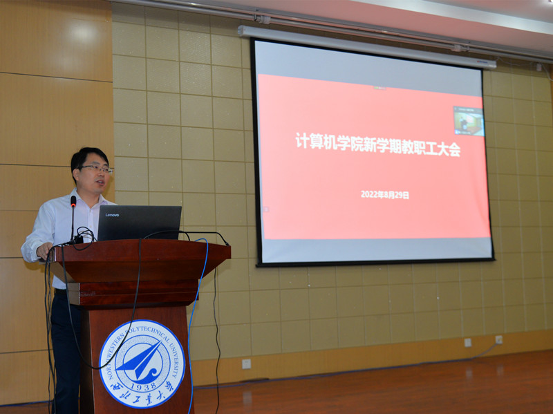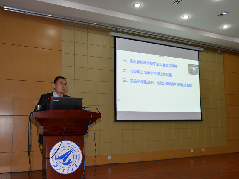 院长於志文传达了学校新学期干部大会会议精神,带领大家重点学习了汪劲松校长《主动服务新时代人才强国战略扎实推进学校人事人才工作高质量发展》的主题报告,以及四位副校长的工作报告,总结回顾了学院2022年上半年的标志性成果,结合学院现状,就“如何实现学科的跨越式发展?如何打造具有全球竞争力的学院?”提出全院要对标一流,实施全球化战略,推动计算机学科跨越式发展。