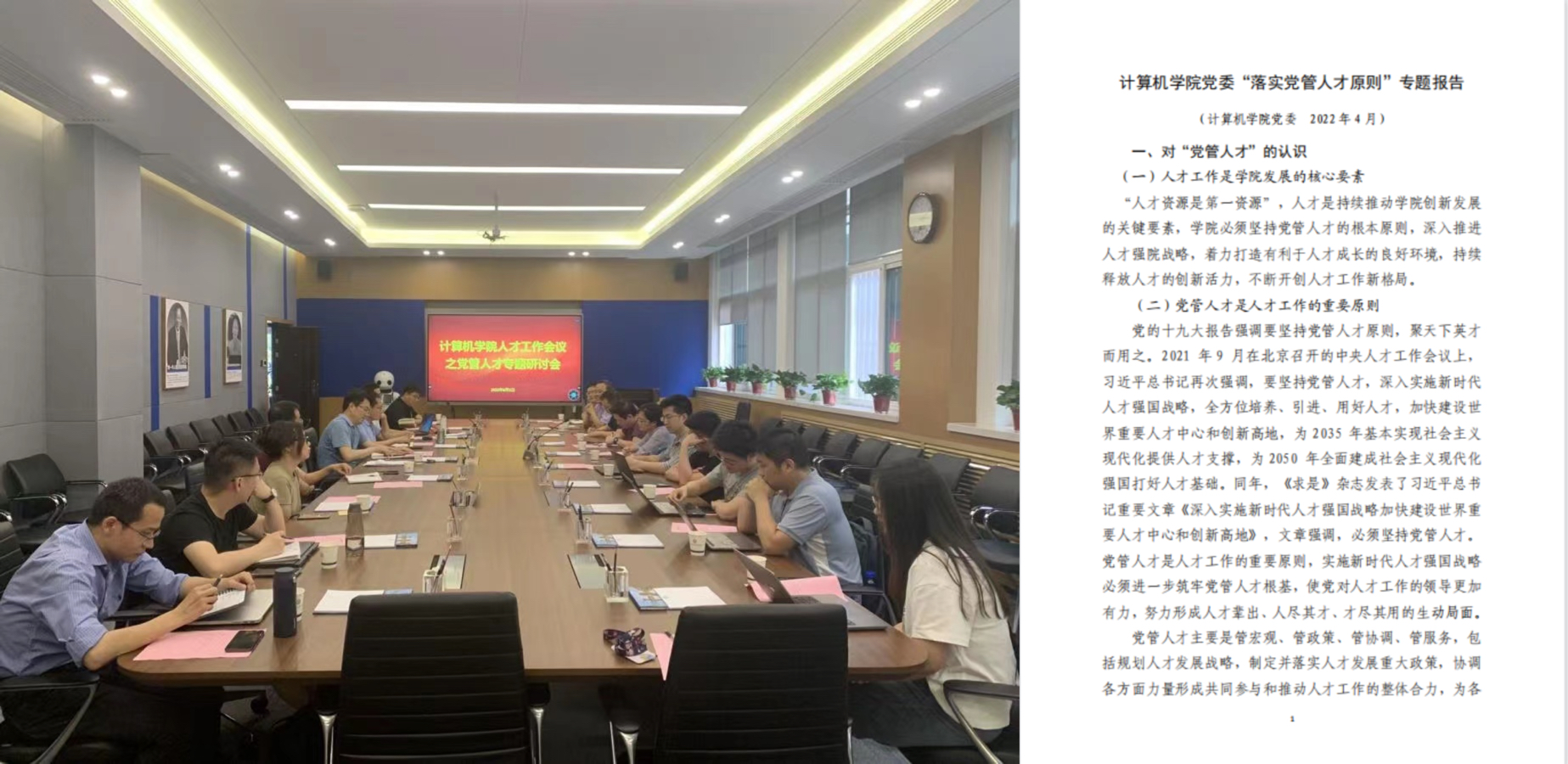 落实党管人才原则。先后召开党管人才专题研讨会、推进高质量融合发展座谈会,开展“落实党管人才原则”专项调研,制定学院教职工教育培训计划,进一步完善党管人才工作格局,不断强化党对人才的政治吸纳、政治引领作用。