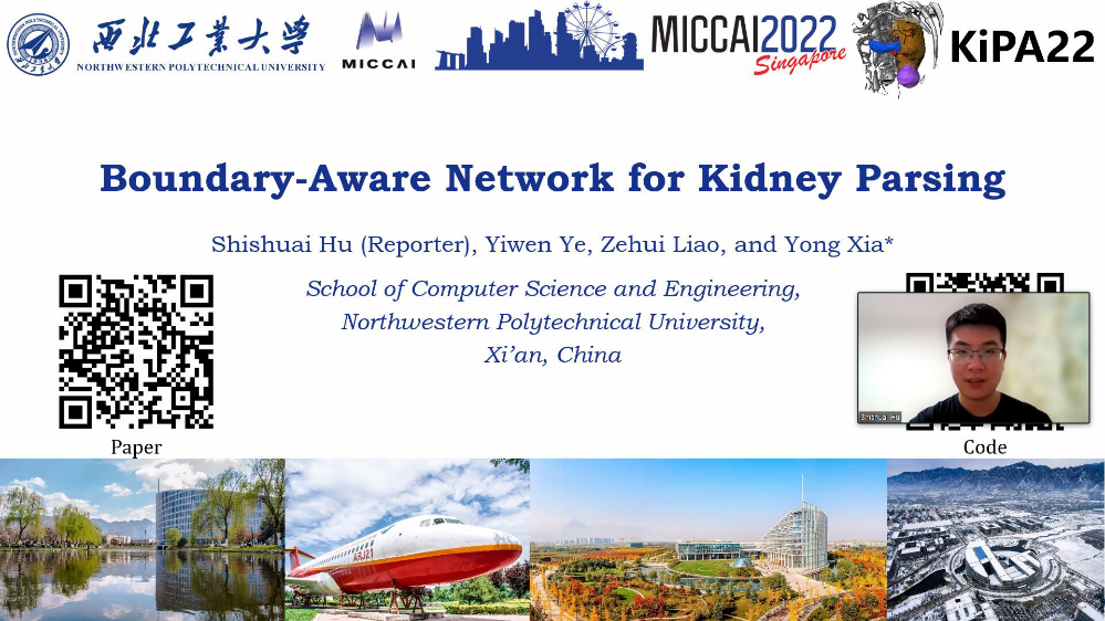 因疫情影响,第二十五届国际医学图像计算和计算机辅助干预会议(MICCAI 2022)于9月18日-22日以“线上+线下”的方式举行。该会议是医学影像智能计算领域的国际顶级会议,除了展示领域内最新研究成果外,还因举办面向各种医学影像辅助诊断场景的国际挑战赛而受到全球研究者和业界的广泛关注。awc777万象城娱乐官网的空天地海一体化大数据应用技术国家工程实验室夏勇教授课题组博士生胡诗帅、叶艺文和廖泽慧组队在肾脏结构分割(Kidney PArsing Challenge,KiPA 2022)竞赛中获得国际亚军并得获创新奖;博士生胡诗帅和廖泽慧组队在颈动脉血管分割和颈动脉斑块诊断(CarOtid vessel wall SegMentation and atherosclerOsis diagnosiS challenge,COSMOS 2022)竞赛中获得国际亚军,并在腹部多器官分割(Abdominal Multi-Organ Segmentation Challenge,AMOS 2022)竞赛的两个任务中均取得第五名。胡诗帅同学应邀在这三个竞赛的主办方组织的学术论坛上进行了成果展示和汇报。这是万象城研究生团队在MICCAI系列挑战赛中取得的又一佳绩,展示了awc777万象城娱乐官网在医学影像智能计算这一新兴交叉研究领域的科研实力。