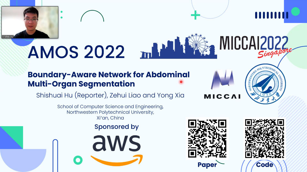 图5.胡诗帅通过视频在MICCAI 2022 Workshop on AMOS上介绍上述研究成果
