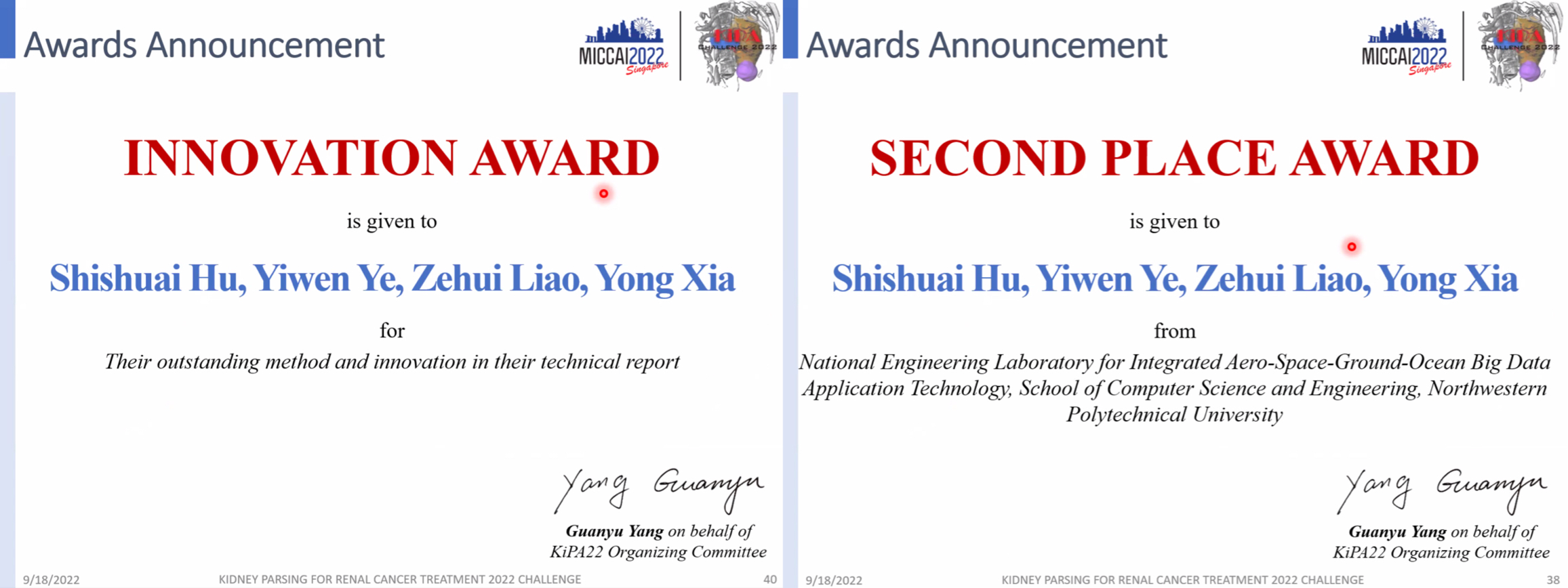 图1. MICCAI KiPA 2022竞赛创新奖和第二名获奖证书
