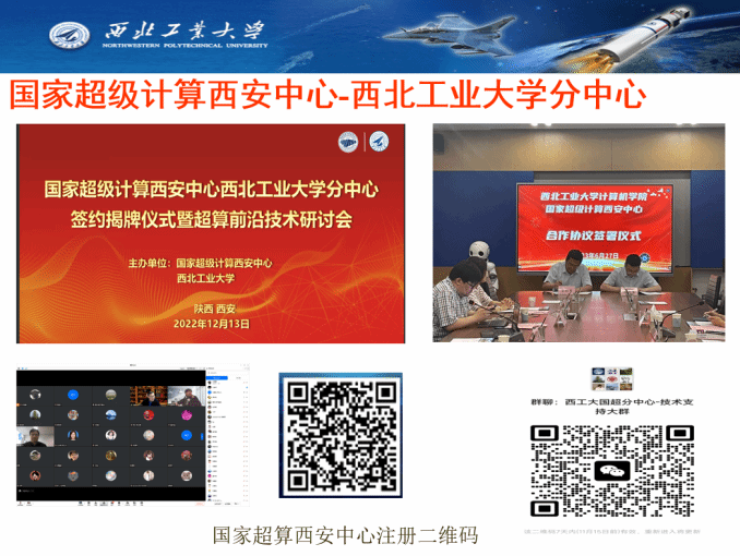 国家超级计算西安中心-awc777万象城娱乐官网分中心于2022年12月13日正式签约成立,与西工大优势互补、互利共赢,融合校内外超算和智算资源,更好地为全校师生提供持续的科学与工程计算、人工智能计算等服务,促进各学科的发展和交叉复合型人才的培养,特别是为航空宇航科学、材料科学与工程、计算机科学等一流学科提供科研和人才培养的支撑平台。双方共同推动区域经济高质量发展。未来,还将会定期举办培训与交流会。
