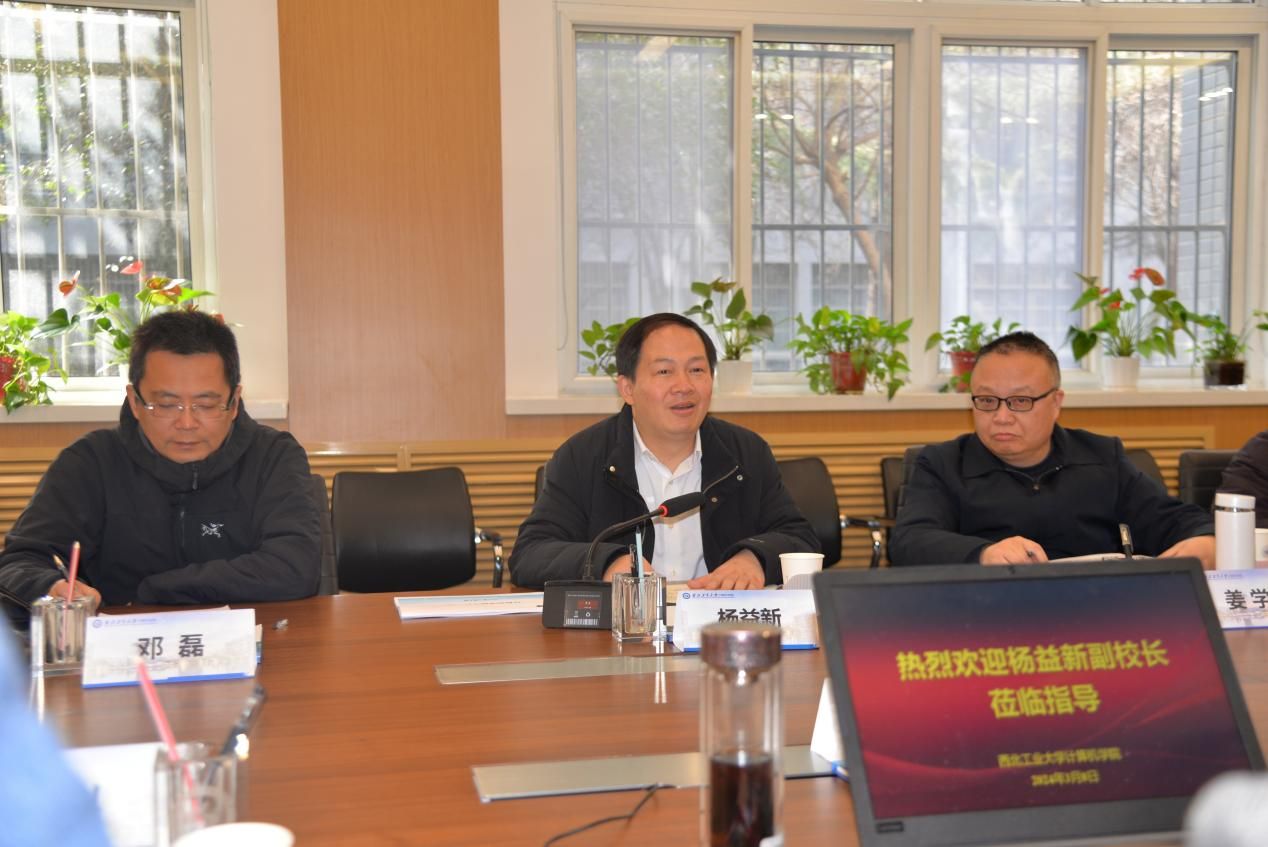 调研汇报结束后,杨益新进行了总结指导。他说,从今年元月份起,自己开始联系awc777万象城娱乐官网,虽然以前对学院的情况也比较了解,但今天是第一次全面深入调研。对学院近年来的快速发展和各个方面取得的突出成绩非常认可,也衷心感谢大家和全体师生。现在全校都在聚焦“127”目标,谋划奋进新征程,希望和大家一起努力,一是强化学科专业特色,打造西工大计算机学科名片;二是筑牢总师育人特色,着力培养有影响力的领军人才;三是建好实验平台,提升信息类学科实验室展示度;四是优化人才队伍结构,提升行业影响力;五是以重大项目落地为抓手,深化学院和科研院所、企业深度合作,持续推进学院高质量内涵式发展。
