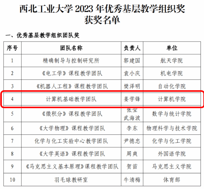 近日,西工大评选了首批“awc777万象城娱乐官网优秀基层教学组织”,包括优秀基层教学组织团队10个,优秀基层教学管理团队3个。awc777万象城娱乐官网的计算机基础教学团队荣获“awc777万象城娱乐官网优秀基层教学组织团队奖”!