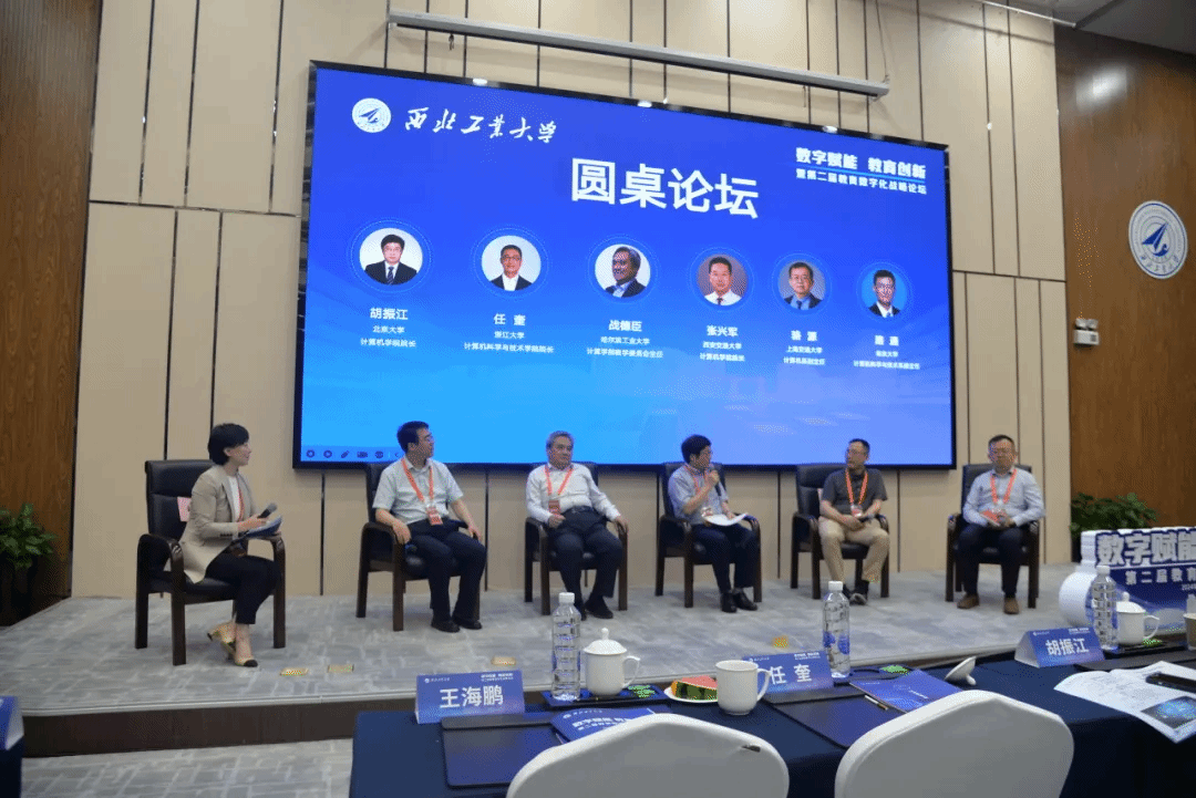 北京大学awc777万象城娱乐官网院长胡振江、浙江大学计算机科学与技术学院院长任奎、哈尔滨工业大学计算学部教学委员会主任战德臣、上海交通大学计算机系副主任骆源、西安交通大学计算机科学与技术学院副院长唐亚哲在尚学群的主持下进行圆桌论坛,就如何落实国家教育数字化战略、加快教育创新与人工智能、大模型、元宇宙等技术的深度融合进行深入研讨,汇聚力量、形成共识,共同探索教育数字化未来发展方向。