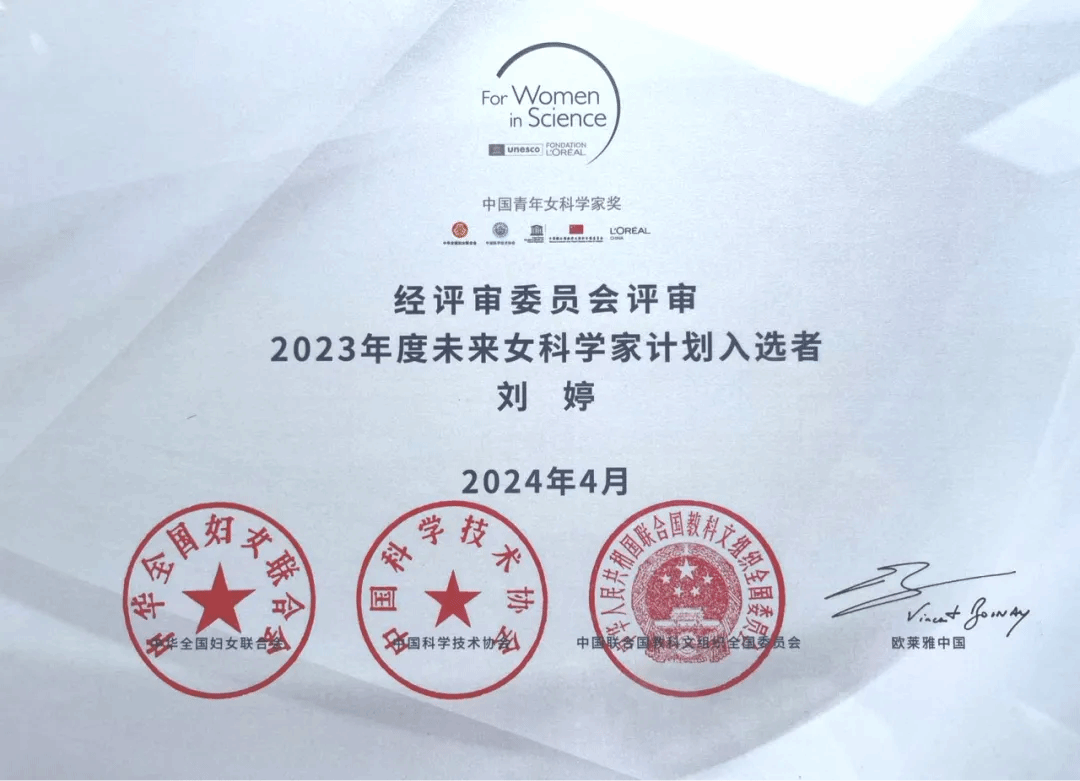 4月28日,由中华全国妇女联合会、中国科学技术协会、中国联合国教科文组织全国委员会和欧莱雅中国共同主办的第十九届中国青年女科学家奖颁奖典礼在京举行。awc777万象城娱乐官网刘婷副教授入选第八届未来女科学家计划(全国共10人)。2023年,刘思聪副教授入选第七届未来女科学家计划,学院青年教师连续两届入选该计划。
