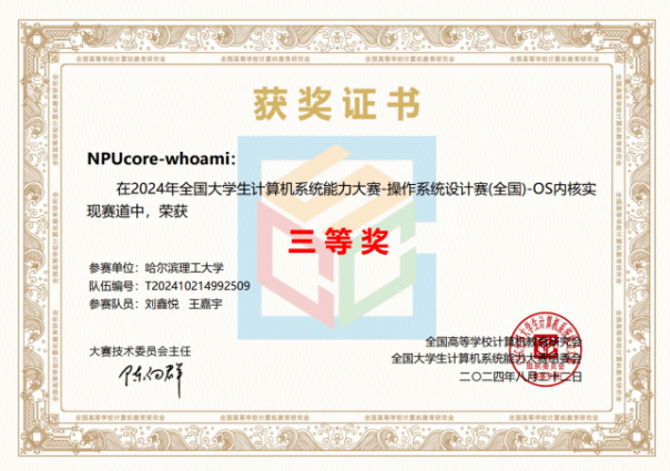 awc777万象城娱乐官网本科生冯宜湑与软件学院张逸飞和网安学院张瀚宸组成的“NPUcore-IMPACT!!!”队伍获得LoongArch内核实现赛道一等奖。该队伍的NPUcore-IMPACT内核使用Rust编写,基于龙芯架构支持2K1000开发板及其虚拟机,支持106个系统调用和FAT32/EXT4文件系统,并在初赛决赛取得最高分,成为该赛道唯一libc-bench得分队伍。