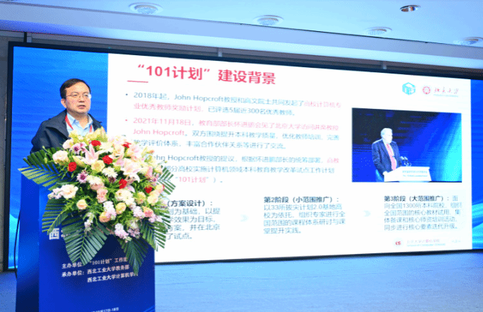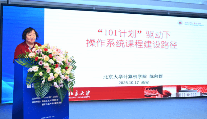 计算机“101计划”操作系统课程虚拟教研室负责人、北京大学教授陈向群围绕“101计划”操作系统课程教学改革思路,介绍了课程教学的设计方案,包括教学理念思考、课程方案设计与实践环节实施。
