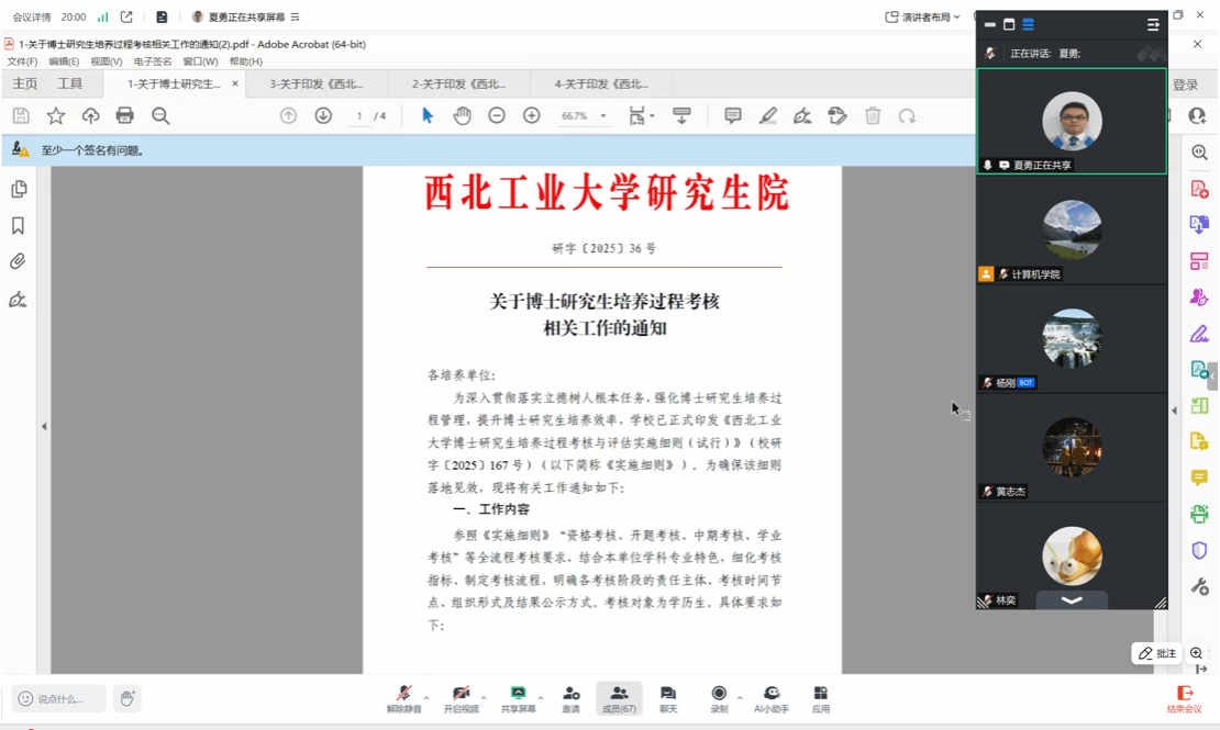 接着,夏勇围绕研究生院的最新文件《关于博士研究生培养过程考核相关工作的通知》进行了详细解读与研讨,带领导师们重点讨论了硕博连读、学位申请改革、导师职责和导学矛盾处理机制等核心议题。针对当前变化和不足,夏勇明确提出下一步工作思路与重点举措:明确硕博连读培养环节执行细则,多措并举加强学生合理诉求保障,加大新版研究生培养与考核制度执行力度,同时进一步加强研究生培养过程关键环节的管理与监督,全面提升研究生培养质量。
