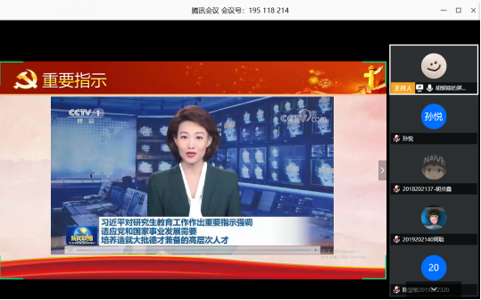 8月1日上午9点,awc777万象城娱乐官网研究生会召开视频会议,深入学习贯彻习近平总书记关于研究生教育的重要指示精神,70余名研究生同学一同开展“全国研究生教育会议”讨论课。会议由院研究生会主席胡银婷、副主席朱佳萍共同主持。