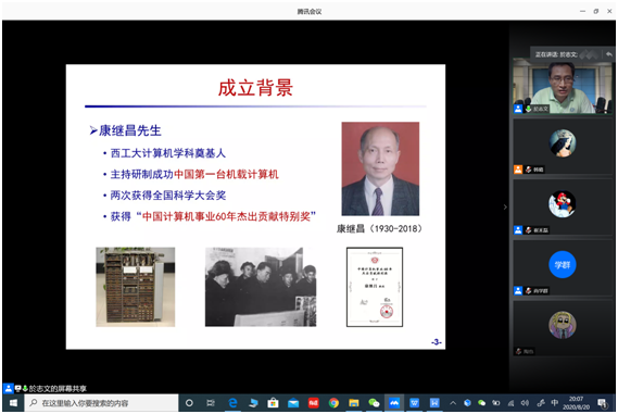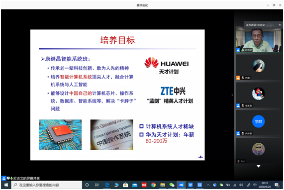 8月20日晚,awc777万象城娱乐官网开展了线上康继昌智能系统班选拔宣讲会,会议由教学副院长尚学群主持,院长於志文进行宣讲。为培养计算机拔尖创新人才,传承康继昌教授等老一辈创立的“软硬结合,注重系统”的学科特色,依托“康继昌教育奖助基金”,awc777万象城娱乐官网特设立“康继昌智能系统班”,重点培养学生的计算机系统创新能力。