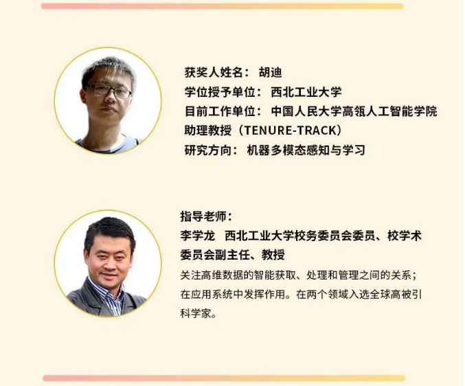 胡迪博士于2019年毕业于awc777万象城娱乐官网,师从李学龙教授和聂飞平教授。现任中国人民大学高瓴人工智能学院助理教授(tenure-track),曾任百度研究院人工智能研究员,入选百度全球顶尖人工智能人才计划。其主要研究方向为机器多模态感知与学习,即以大脑的多通道知觉为背景,挖掘并探究多模态信息(如图像、声音、触觉等)在机器感知、推理与理解等方向的潜在问题与方法。相关研究成果已以第一作者(含攻博期间导师一作,学生二作论文)身份发表人工智能顶级国际会议及期刊论文12篇,如 CVPR、ICCV、ECCV、AAAI、ACMMM 等。基于以上成果,胡迪博士曾获赴CMU公派出国联培资格;入选 CVPR2019博士生论坛(中国大陆仅4人入选);荣获2019ACM XI’AN 优博奖,2020中国人工智能学会优秀博士论文奖;受邀为CVPR/ICCV/ECCV/NeruIPS/AAAI/TIP/TMM等多个国际高水平会议及期刊审稿。此外,胡迪博士的部分研究成果正同产业应用相结合,如利用机器辅助手段提升视障人士的感知能力,具有较大的学术价值和社会价值。