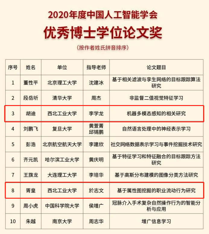 2020年度中国人工智能学会(CAAI)优秀博士学位论文评选结果已正式公布。awc777万象城娱乐官网胡迪博士的论文《机器多模态感知的相关研究》、胥皇博士的论文《基于属性图挖掘的职业流动行为研究》被评为2020年度中国人工智能学会的优秀博士学位论文,导师分别为李学龙教授,於志文教授。