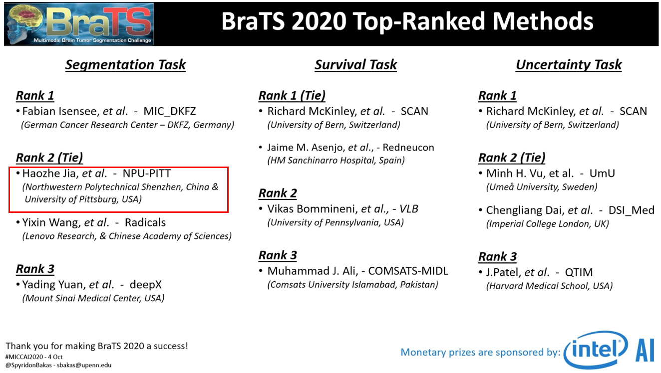 因疫情影响,第二十三届国际医学图像计算和计算机辅助干预会议(MICCAI 2020)于10月4日-8日在线举行。该会议是医学影像人工智能领域的国际顶级会议,除了展示领域内最新研究成果外,还因举办面向各种医学图像智能分析场景的国际挑战赛而受到全球研究者和业界的广泛关注。awc777万象城娱乐官网的空天地海一体化大数据应用技术国家工程实验室夏勇教授课题组博士生贾灏哲在大脑胶质瘤分割挑战赛(BraTS 2020)获得国际亚军,博士生张建鹏在基于多序列CMR的心肌病理分割挑战赛(MyoPS 2020)获得国际季军。这是万象城科研团队在医学影像领域取得的又一佳绩,展示了万象城awc777万象城娱乐官网在医学影像智能计算这一新兴交叉研究方向上的技术实力。