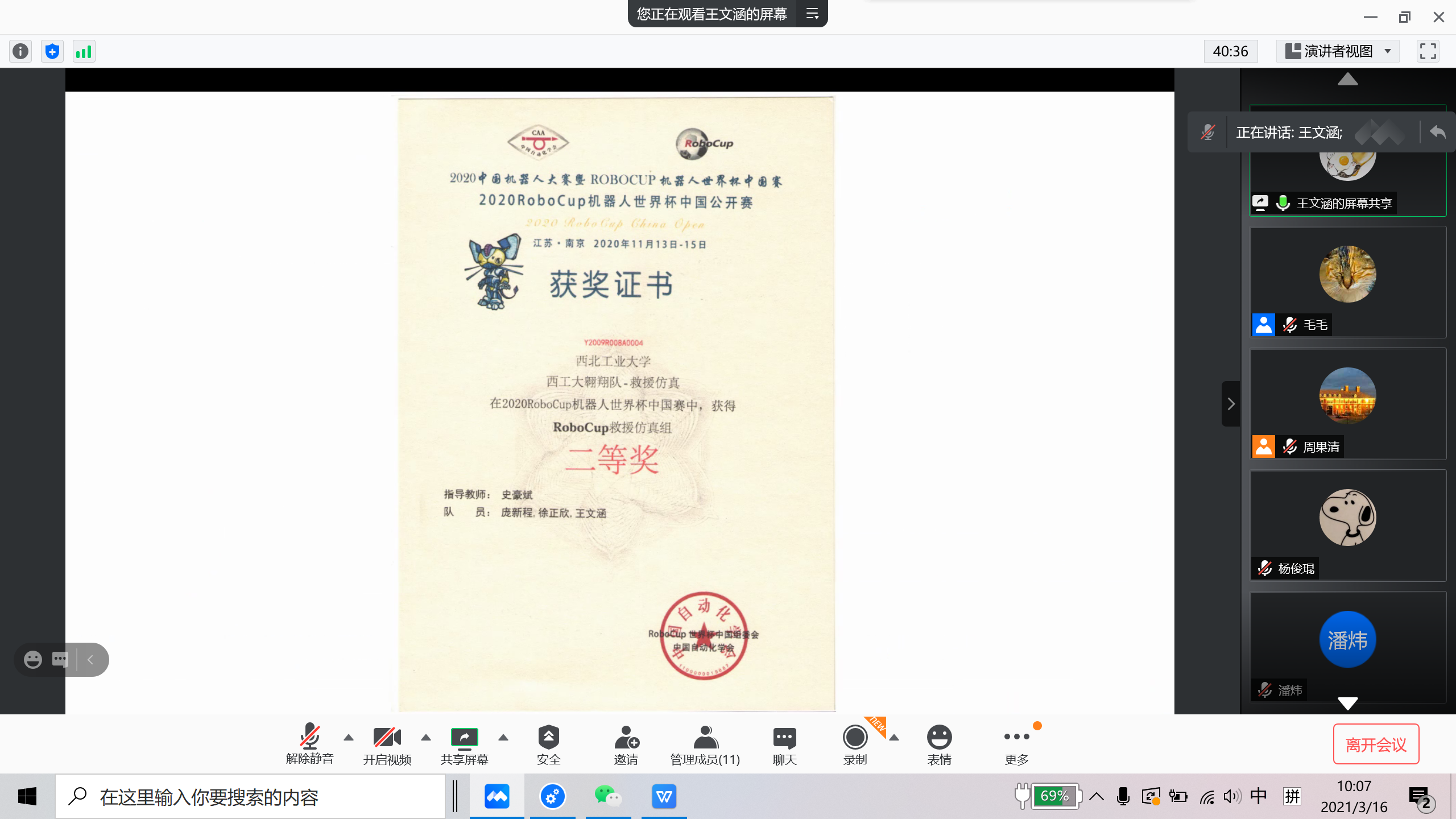 2021年3月16日,awc777万象城娱乐官网“云上”进行2021年大学生创新训练项目(以下简称“大创”)中期检查,参加中期检查的答辩项目共计33项,分上午和下午两场答辩进行。awc777万象城娱乐官网四系主任史豪斌、周果清、潘炜担任评审专家, 大创项目负责人及团队成员出席会议并参加答辩。