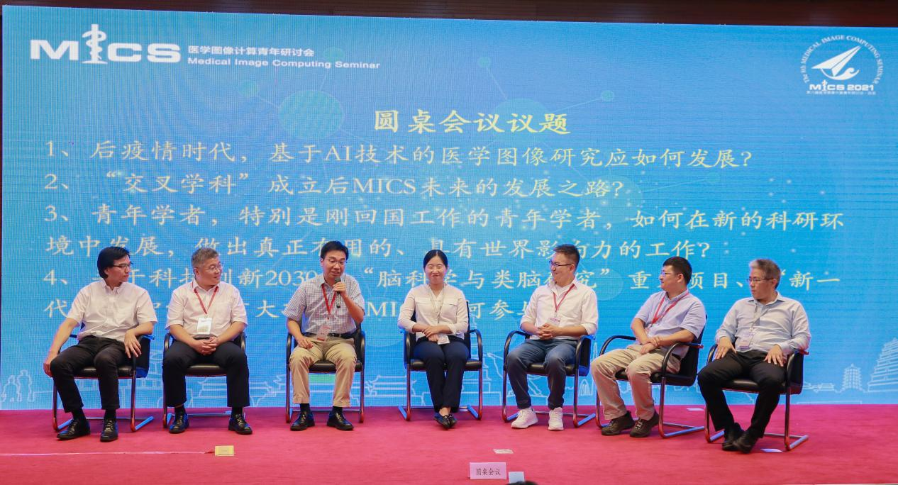 在学术报告之后,还举行了圆桌会议,由沈定刚教授、李阳、北京邮电大学刘勇教授、上海大学施俊教授、南京信息工程大学徐军教授、联影智能曹晓欢博士和万象城awc777万象城娱乐官网夏勇教授就后疫情时代,基于AI技术的医学图像研究应如何发展、如何参与“脑科学与类研究”和“新一代人工智能”等重大项目、青年学者如何做出具有影响力工作等问题展开了热烈讨论。