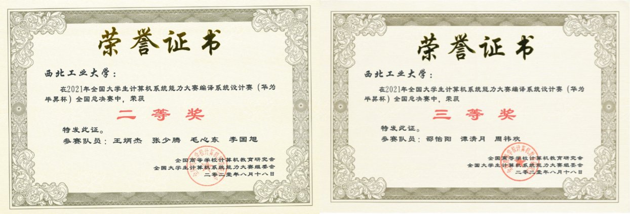 两支参赛队的同学综合运用各种知识构思并实现了一个综合性的编译系统,把自定义程序设计语言SysY2021(C语言的子集)翻译成ARM汇编语言程序,在树莓派4B平台上运行展示编译器构造与编译优化的效果,两支参赛队均取得了优异成绩。